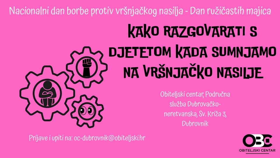Povodom obilježavanja Nacionalnog dana borbe protiv vršnjačkog nasilja još poznatog i kao Dan ružičastih majica Obiteljski centar vas poziva na interaktivno predavanje
