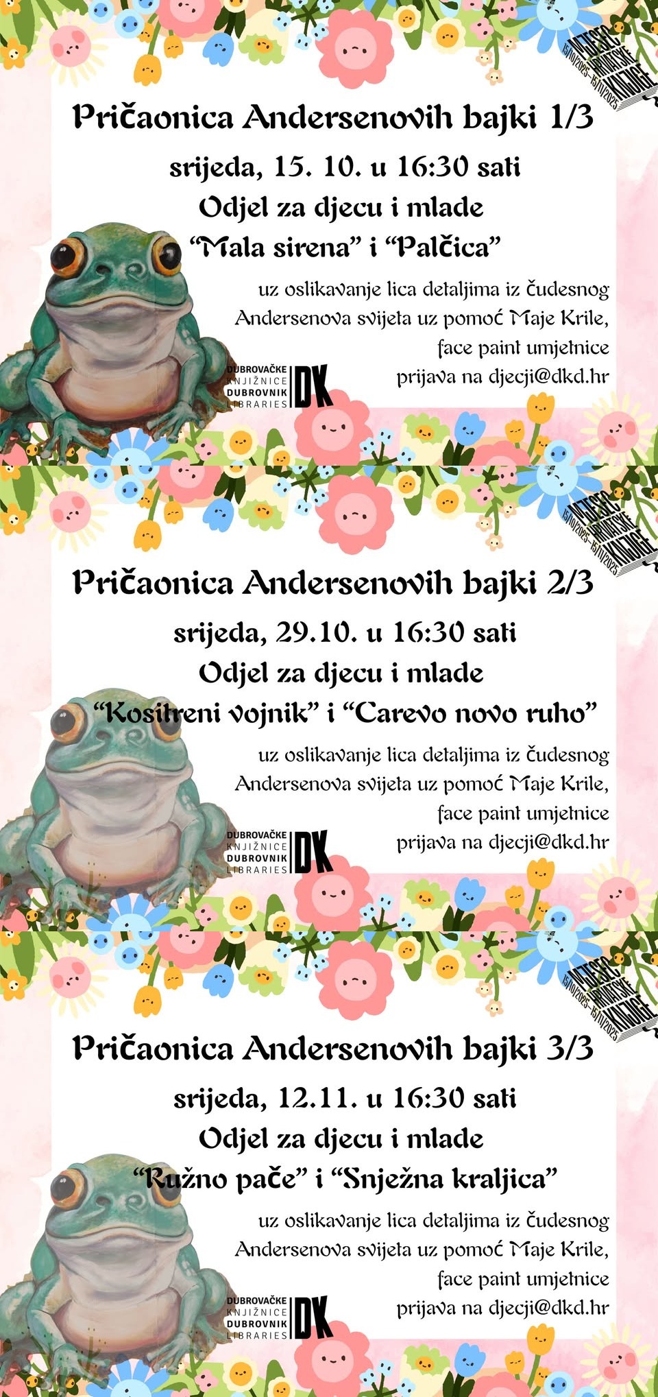 Dubrovačke knjižnice najavljuju otvorenje Hrvatskog mjeseca knjige prvom od tri Pričaonice / “face paint” radionice. Prva Pričaonica Andersenovih bajki održat će se u srijedu, 15. listopada 2025. na Odjelu za djecu i mlade Narodne knjižnice Grad (Ulica od puča 6) s početkom u 16:30 sati. Čitat će se Mala sirena i Palčica. U sklopu pričaonice, face paint umjetnica Maja Krile oslikavat će lica detaljima iz čudesnog Andersenova svijeta.