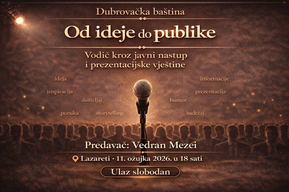 Predavanja/radionice “Umijeće storytellinga” održane prošle godine privukle su veliki broj posjetitelja pa će na traženje publike Vedran Mezei održati još jedno predavanje o unaprjeđivanju komunikacijskih vještina „Od ideje do publike – vodič kroz javni nastup i prezentacijske vještine“, u srijedu, 11. ožujka 2026. u 18 sati u 5. lađi Lazareta.
