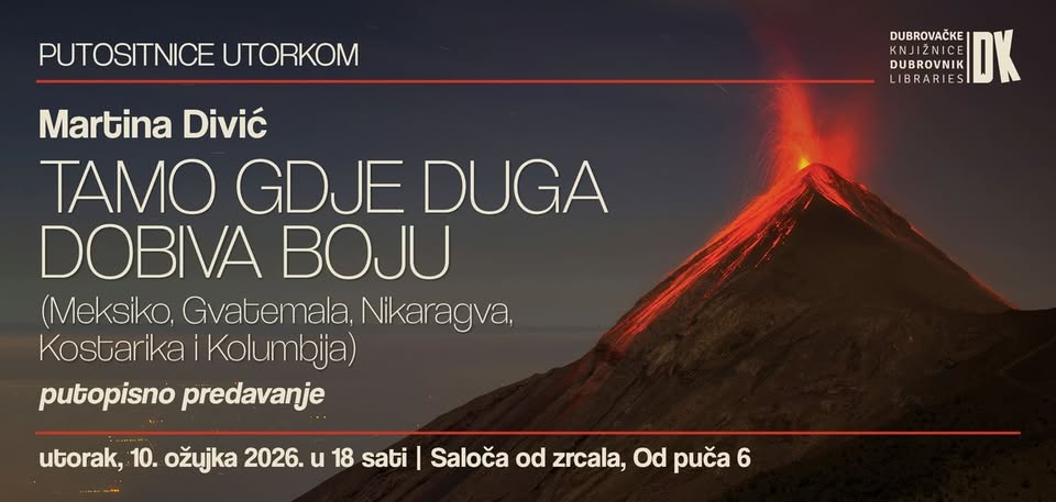 U sklopu programa 𝐏𝐮𝐭𝐨𝐬𝐢𝐭𝐧𝐢𝐜𝐞 𝐮𝐭𝐨𝐫𝐤𝐨𝐦, Dubrovačke knjižnice ugostit će 𝐌𝐚𝐫𝐭𝐢𝐧𝐮 𝐃𝐢𝐯𝐢ć, koja će održati predavanje i predstaviti svoju knjigu “𝐓𝐚𝐦𝐨 𝐠𝐝𝐣𝐞 𝐝𝐮𝐠𝐚 𝐝𝐨𝐛𝐢𝐯𝐚 𝐛𝐨𝐣𝐮“.