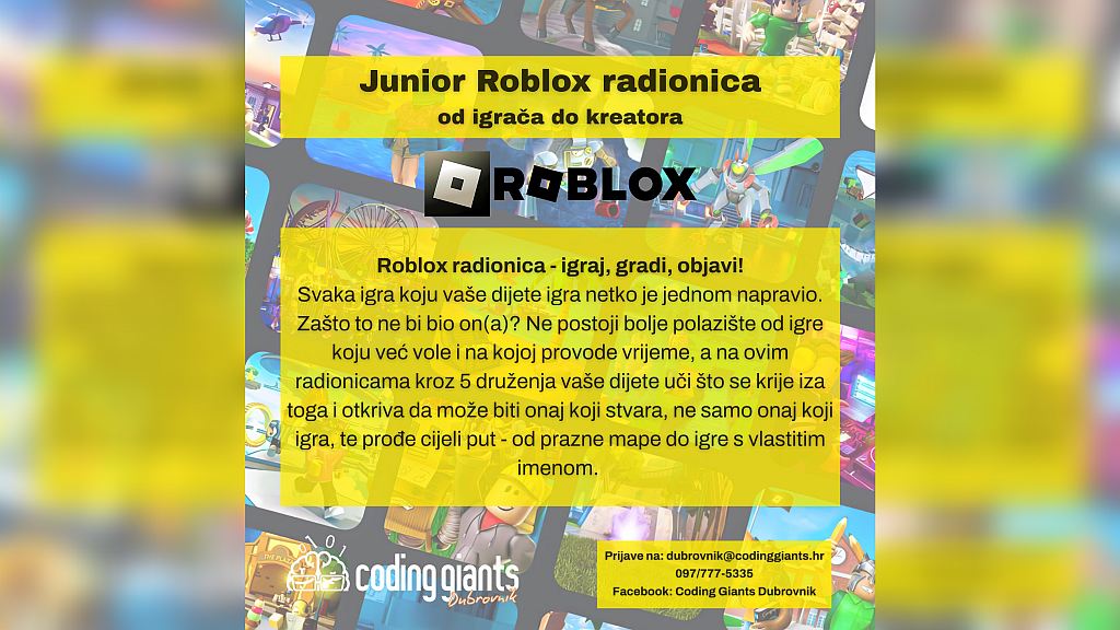 Roblox radionice su 5 druženja u kojima klinci od 10 do 12 godina prolaze cijeli put od praznog ekrana do vlastite igre koju mogu podijeliti s prijateljima i cijelom Roblox zajednicom. Svaka radionica je novi korak, prvo grade vlastitu mapu od nule i u nju uđu kao igrač, zatim igri “govore” što da se dogodi kad igrač nešto dodirne ili skoči, onda osmišljavaju vlastitu stazu s preprekama (svačija je drugačija), pa je testiraju, ispravljaju i objavljuju pravoj Roblox zajednici.