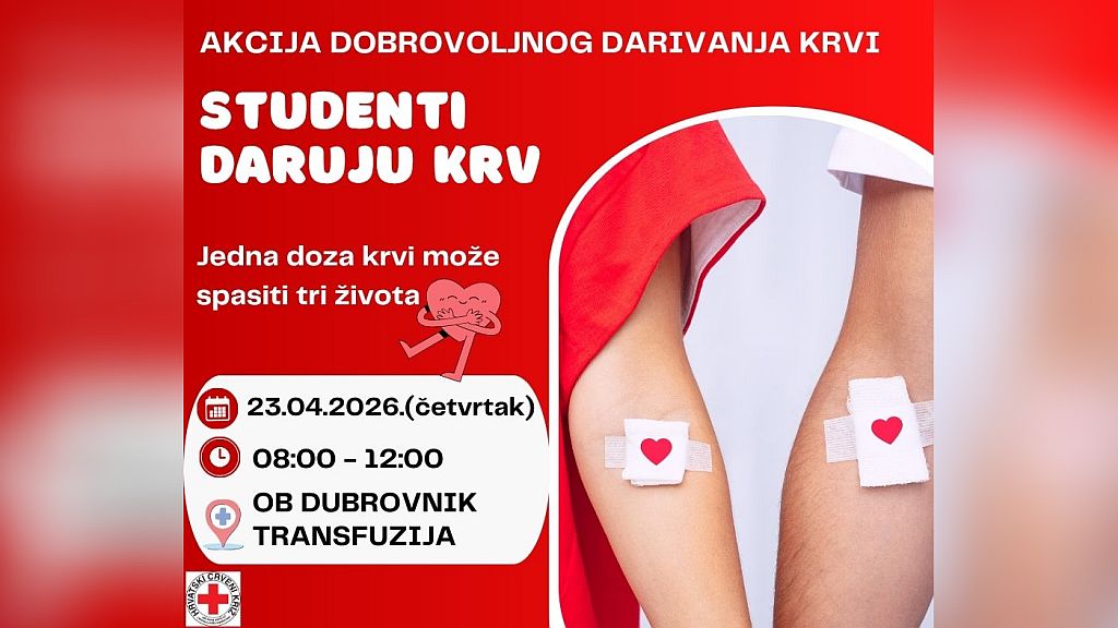 Opća bolnica Dubrovnik dr. Roka Mišetića 2, Dubrovnik, CroatiaPozivamo Vas na akciju darivanja krvi koja će se održati: Datum: 23. travnja 2026. Vrijeme: 09:00 - 12:00Lokacija: OB Dubrovnik - Transfuzija Ne moraš nositi plašt da bi bio heroj. Ponekad je dovoljno samo pružiti ruku i dati krv.