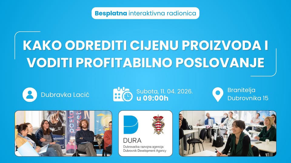 Apr 11 9:00 - 17:00 BESPLATNA RADIONICA: „KAKO ODREDITI CIJENU PROIZVODA I VODITI PROFITABILNO POSLOVANJE“ DURA Razvojna Agencija Grada Dubrovnika / Dubrovnik's Development Agency Branitelja Dubrovnika 15, Dubrovnik Event Details Get Directions