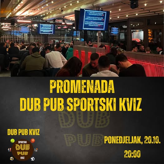 Ponedjeljak, 20:00, Promenada. Kviz znanja isključivo sportske tematike! Sve ekipe sudionici dobijaju prigodnu nagradu Prijave su otvorene! Vidimo se |