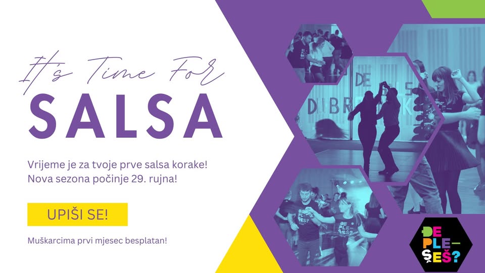 Vrijeme je da otkrijete salsu! Upisi počinju 29.9.! Raspored: Ponedjeljkom 21:00 – 22:00 Srijedom 19:45 – 20:45 Lokacija: Robna kuća Srđ, Obala Stjepana Radića 25 (ulaz s gornje strane) Cijena: 25 € mjesečnoČlanarina se plaća do 10. u mjesecu za nadolazeći mjesec. Momcima prvi mjesec besplatan! Curi koja dovede momka na tečaj prve dvije clanarine […] |
