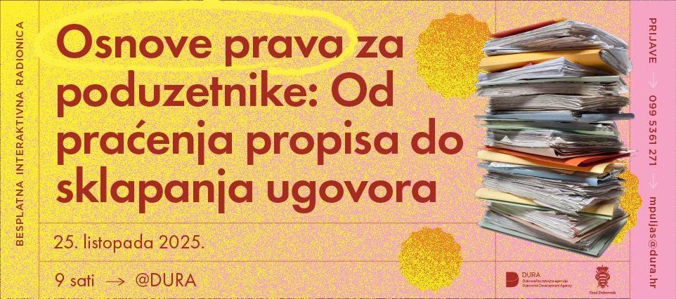 Znate li koji se sve propisi odnose na vaše poslovanje? Jeste li sigurni da ispravno sklapate poslovne dogovore, odnosno ugovore? Imate li dovoljno znanja da zaštitite svoje poslovanje od pravnih rizika? Ako u bilo kojem od ovih pitanja niste 100% sigurni u odgovor – ova radionica je stvorena baš za vas! DURA u sklopu Startup akademije organizira […]