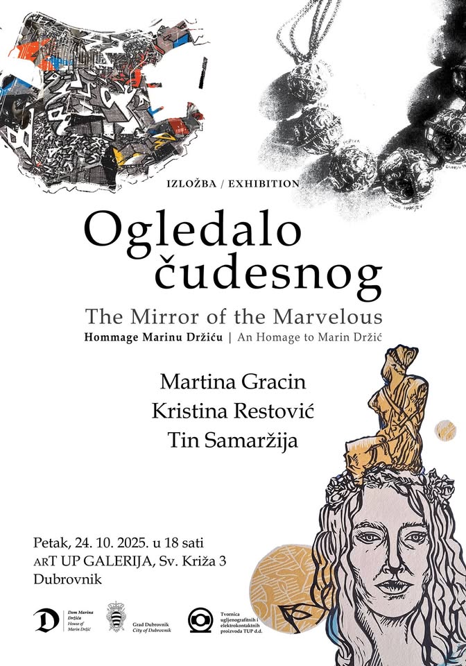 HOMMAGE MARINU DRŽIĆU U ART UP GALERIJIDom Marina Držića u suradnji s Tvornicom ugljenografitnih i elektrokontaktnih proizvoda (TUP) poziva Vas na otvorenje izložbe „Ogledalo čudesnog / Hommage Marinu Držiću“ troje istaknutih hrvatskih grafičarki i grafičara Martine Gracin, Kristine Restović, i Tina Samaržije. U sklopu izložbe, čije će otvorenje biti upriličeno u prostoru ART UP Galerije […] |