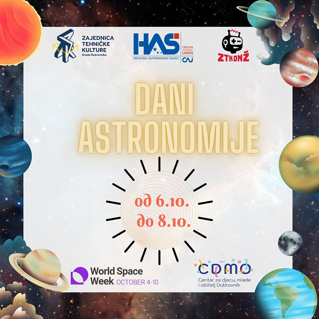 U organizaciji Zajednica tehničke kulture Grada Dubrovnika i Dubrovačko-neretvanske županije te Hrvatski astronomski savez obilježit će se Svjetski tjedan svemira Hrvatska s temom „Živjeti u svemiru“. U ponedjeljak 6. listopada započinju Dani astronomije gdje će do 8. listopada biti organizirana javna promatranja Mjeseca i Saturna, radionica o Sunčevom sustavu te Mala škola astronomije u Centar […]   FOR ENGLISH, SCROLL DOWN Registracija se otvara uskoro, pratite nas! KONAVLE TANGO DREAM - jedan vrlo poseban festival, stvoren od strane i za sve one koji žele uživati u tangu, a ipak se dobro naspavati. Svaki dan donosi dovoljno prilika za uživanje u prirodnim i povijesnim ljepotama Konavala danju i tangu navečer. Naš je naglasak […]