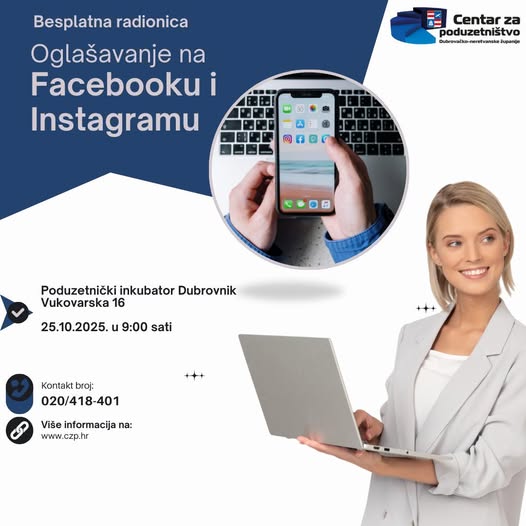 𝐃𝐚𝐭𝐮𝐦: 25.10.2025. 𝐕𝐫𝐢𝐣𝐞𝐦𝐞: 09:00 𝐋𝐨𝐤𝐚𝐜𝐢𝐣𝐚: Poduzetnički inkubator Dubrovnik, Vukovarska 16 Za koga je radionica: Za sve koji žele naučiti kako učinkovito oglašavati na Facebooku i Instagramu – bilo da ste poduzetnik, freelancer, zaposlenik ili tek razmišljate o oglašavanju. Pridružite nam se na praktičnoj radionici "Oglašavanje na društvenim mrežama" u organizaciji Centra za poduzetništvo DNŽ, gdje […]
