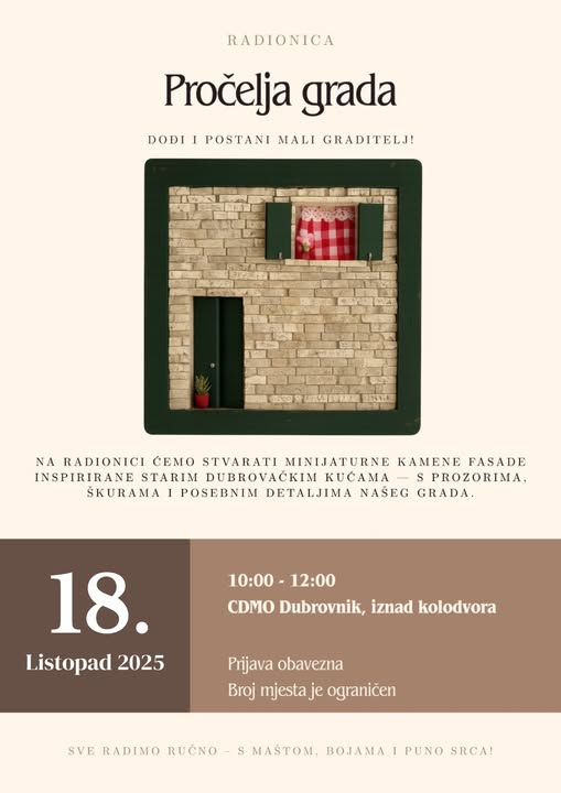 Za sve kreativce od 3. do 8. razreda osnovne škole — u subotu, 18. listopada u 10 sati, održat će se radionica izrade malih kamenih pročelja inspiriranih dubrovačkim kućama i ljetnikovcima. Polaznici će u Centar za djecu, mlade i obitelj Dubrovnik slagati zidove od sitnih kamenčića u drvene okvire, dodavati prozore, škure i druge detalje […]   PRVENSTVO HRVATSKE U AUTOSLALOMU - KUP POVIJESNIH AUTOMOBILA - TOČNOŠT PRVENSTVO REGIJE JUG TRENINZI: 10:00-11:30 UTRKE: 12:00-17:00 |