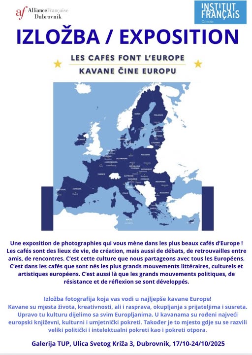 Kavane čine Europu! U galeriji TUP je otvorena izložba “Kavane čine Europu”, a možete je pogledati do 24.10. No, posebno vas pozivamo da nam se pridružite u ponedjeljak, 20. listopada u 19 sati, kada ćemo uz piće dobrodošlice zajedno razgledati izložbu i obilježiti početak novih tečajeva francuskog jezika. Dođite, opustite se uz dobru atmosferu, umjetnost […]