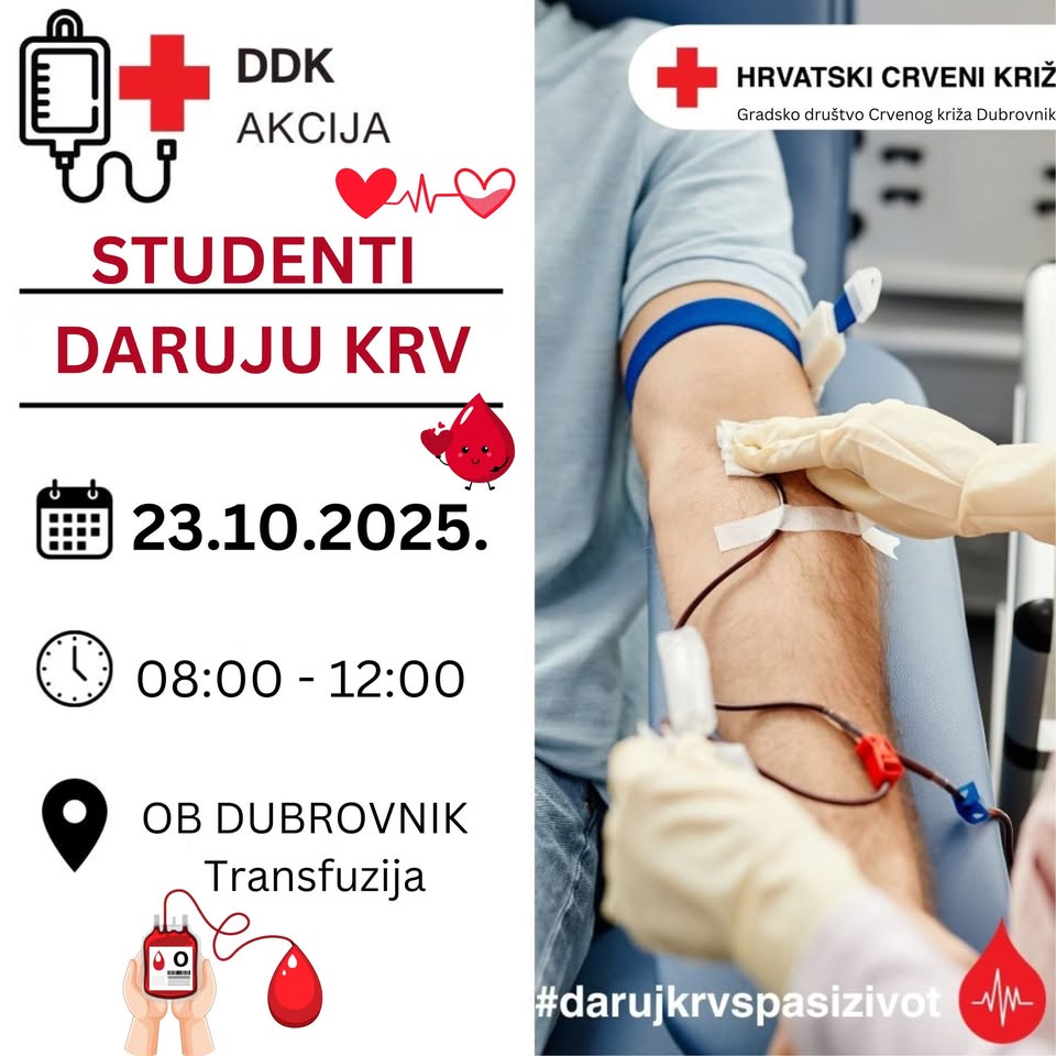 DARUJ KRV - SPASI ŽIVOT Hej studenti!Pridruži se akciji darivanja krvi i pokaži velilo srce koja će se održati: Datum: 23. listopada 2025. Vrijeme: 08:00 - 12:00Lokacija: Opća bolnica Dubrovnik - Transfuzija Ne moraš nositi plašt da bi bio heroj. Ponekad je dovoljno samo pružiti ruku i dati krv. #DarujKrv #StudentskaAkcija #