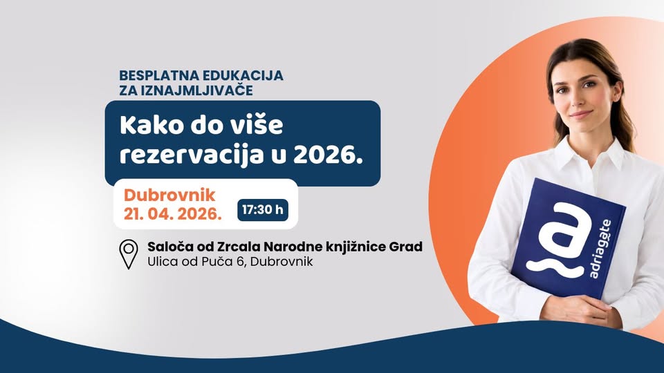 Narodna knjižnica Grad Ulica od Puča 6, Dubrovnik, Dubrovačko-neretvanska, CroatiaLINK ZA PRIJAVU: https://forms.gle/k2JdzGfsfwDd2Nav7 Ovim vas putem pozivamo na edukaciju za iznajmljivače koju organizira Adriagate pod nazivom „Kako do više rezervacija u 2026". Edukacija će se održati u utorak, 21. 04. 2026. godine u Saloči od zrcala Narodne knjižnice Grad, na adresi Ulica od Puča 6, Dubrovnik, s početkom u 17:30 sati. Na edukaciji Vas očekuju […]