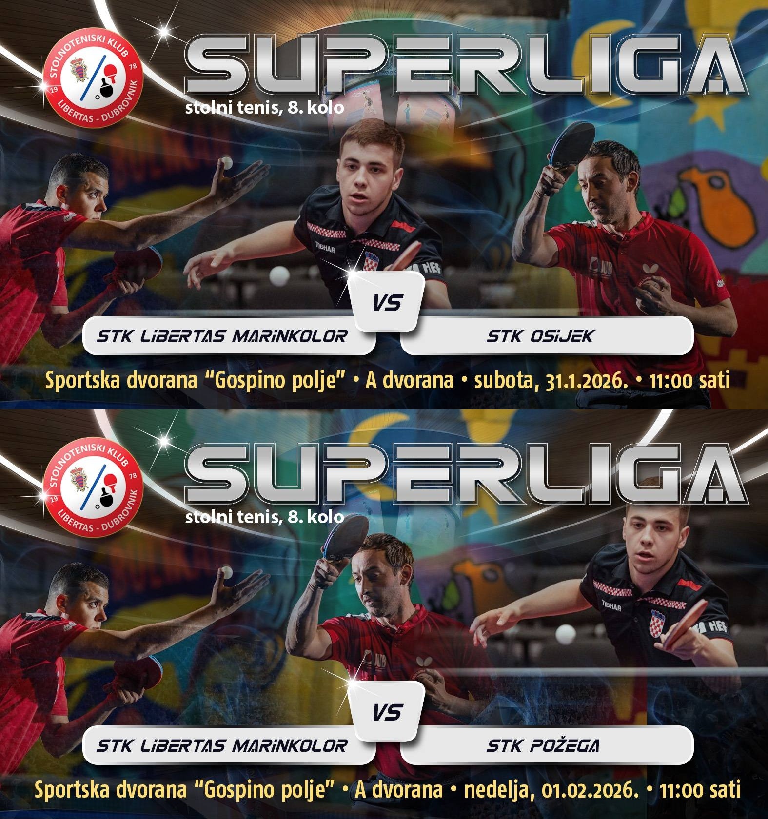 Sportska dvorana Gospino polje Liechtensteinov put 10, Dubrovnik, Dubrovačko-neretvanska, CroatiaSUPERLIGA - 8. KOLO (Dubrovnik) Subota, 31. siječnja 2026. | 11:00 STK LIBERTAS MARINKOLOR STK OSIJEK Nedjelja, 1. veljače 2026. | 11:00 STK LIBERTAS MARINKOLOR STK POŽEGA Zbog energerske obnove B dvorane, oba susreta igrati će se u velikoj A dvorani u Gospinom polju. Dodite u subotu i nedjelju u 11 sati u Gospino polje […]