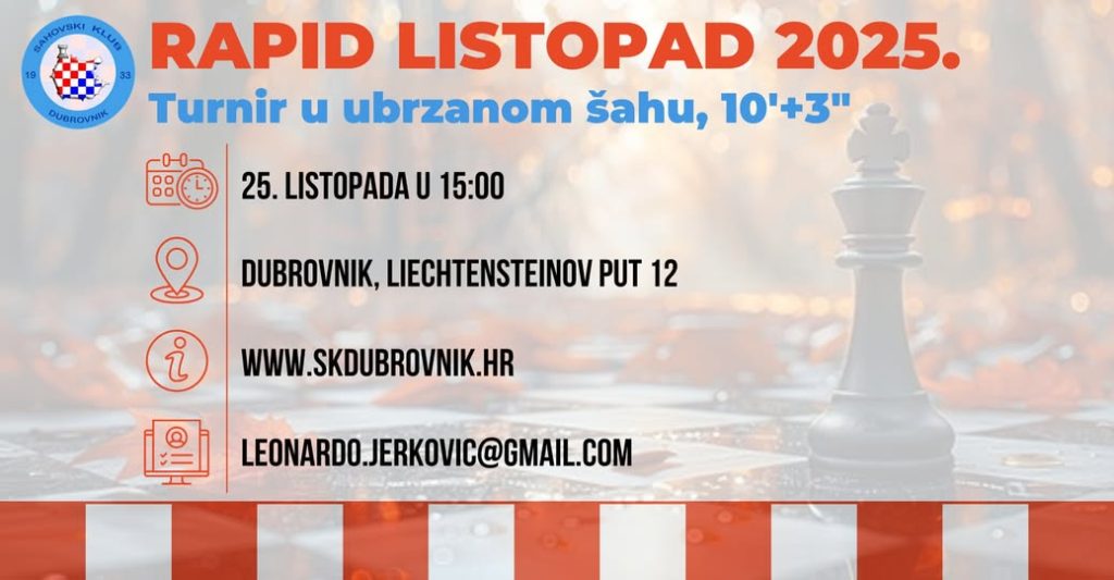[RASPIS UBRZANOG ŠAHOVSKOG TURNIRA] RAPID LISTOPAD 2025. Subota, 25.10.2025. Početak u 15:00 sati Lista prijavljenih igrača: https://s1.chess-results.com/tnr1270398.aspx?lan=1&SNode=S0 Informacije i raspis: https://www.skdubrovnik.hr/…/raspis-sahovskog-turnira…/