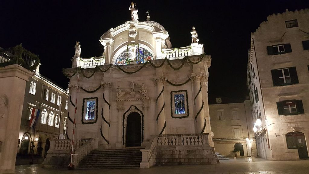 Barokna crkva sv. Vlaha, zaštitnika grada Dubrovnika, sagrađena je na mjestu starije romaničke crkve (14. stoljeće), koja je preživjela veliki potres 1667. godine, ali je izgorjela u požaru 1706. godine. Crkva je oštećena u potresu godine 1979. godine, a u Domovinskom ratu (1991. - 1992.) oštećena je pogodcima, najjače na krovu i sjevernom pročelju. Veliko vijeće 26. veljače 1348. godine donosi odluku o gradnji crkve sv. Vlaha na Platea Communis, na mjestu gdje je i današnja (barokna), ispred Vijećnice. Iz odluke o izgradnji nove crkve sv. Vlaha na navedenome mjestu još se može iščitati želja Dubrovčana za stjecanjem neovisnosti o mletačke vlasti, posebice ako se uzme u obzir arhivski podatak da je dubrovački nadbiskup Ilija Sarakapostavio temeljni kamen crkve.[1] Godine 1558. orgulje orguljara Colombija postavljene su u crkvu.[2] Nova barokna crkva izgrađena je od 1706. do 1715. godine po nacrtima mletačkog graditelja Marina Gropellija. Crkva ima bogato ukrašeno pročelje s portalom, a ispred njega su široke stube. Središnji prostor crkve nadvišen je kupolom. Na glavnom mramornom oltaru nalazi se kip sv. Vlahaod pozlaćenog srebra, rad dubrovačkih majstora iz 15. stoljeća. U rukama drži maketu grada prije potresa 1667. godine. Kip je preživio i potres i požar u crkvi. Svake se godine 3. veljače u Dubrovniku slavi Festa Svetog Vlaha.