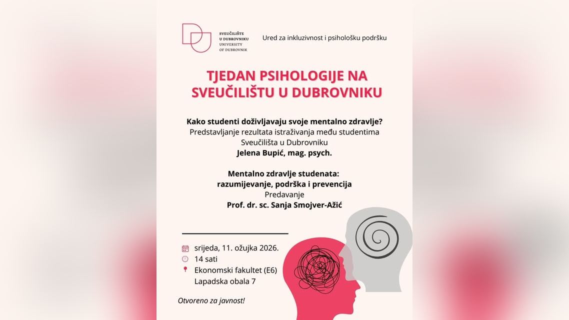 Sveučilište u Dubrovniku - Lapadska obala Lapadska obala 7, Dubrovnik, Dubrovačko-neretvanska, CroatiaTjedan psihologije na Sveučilištu u Dubrovniku Kako studenti doživljavaju svoje mentalno zdravlje? U sastavu Tjedna psihologije održat će se predstavljanje rezultata istraživanja provedenog među studentima Sveučilišta u Dubrovniku te predavanje o razumijevanju, podršci i prevenciji u području mentalnog zdravlja studenata. Sudionice: Jelena Bupić, mag. psych. Prof. dr. sc. Sanja Smojver-Ažić srijeda, 11. ožujka 2026. 14 […]