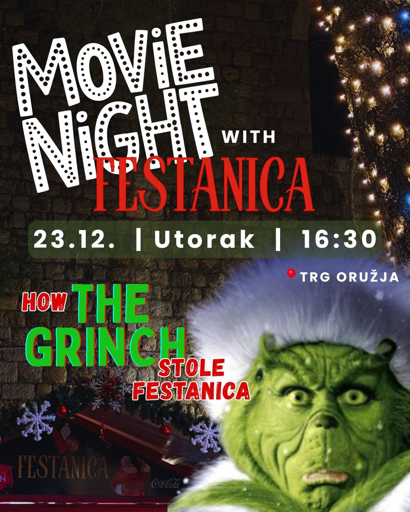 Trg oružja Ul. Svetog Dominika 3, Dubrovnik, Dubrovačko-neretvanska, CroatiaGledamo “How the Grinch stole Christmas” na Festaničnom, vanjskom kinu! Vidimo se uz iće i piće 🥰❤️💃🎄✨ a za top atmosferu nakon filma zaslužan će biti naš DJ @alexg__official od 20:00 sati!! #grinch #movienight #christmastime #advent #festanica #bozic #dubrovnik #fyp #winterseason
